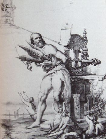 Der gefesselte Prometheus. Allegorie auf das Verbot der "Rheinischen Zeitung", 1843 als Flugblatt verbreitet. Hier kämpft das Bürgertum, Karl Marx war zeitweise Redakteur des Blattes, noch um die Pressefreiheit gegen die adlige Regierung.